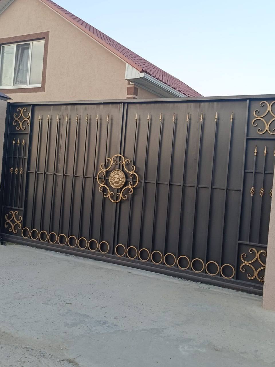 Наши откатные ворота сочетают прочность и эстетику. Каркас выполнен из профильной трубы 60×40×2 мм, а заполнение — из металлического листа толщиной 3 мм с изящными коваными элементами, украшенными позолотой. Ширина проёма — 4,8 м, высота — 2,8 м, что идеально подходит для любого участка.