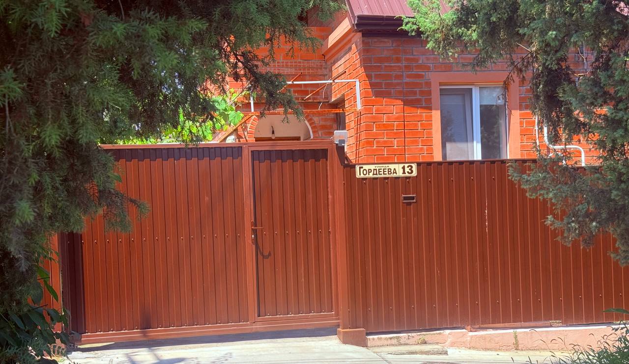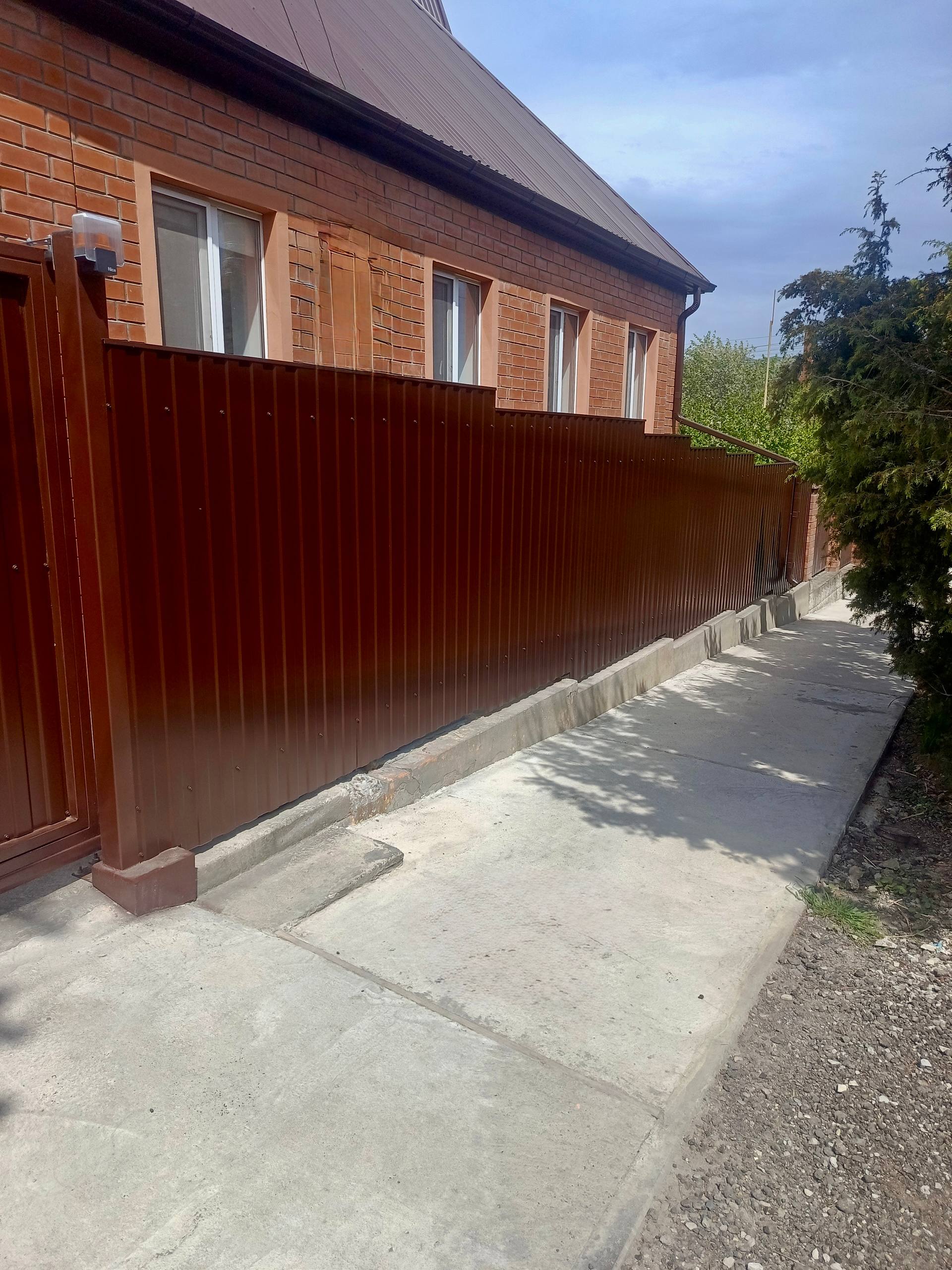 - Конструкция забора: 7 секций с каркасом из профильной трубы, заполнение — профлист С8.